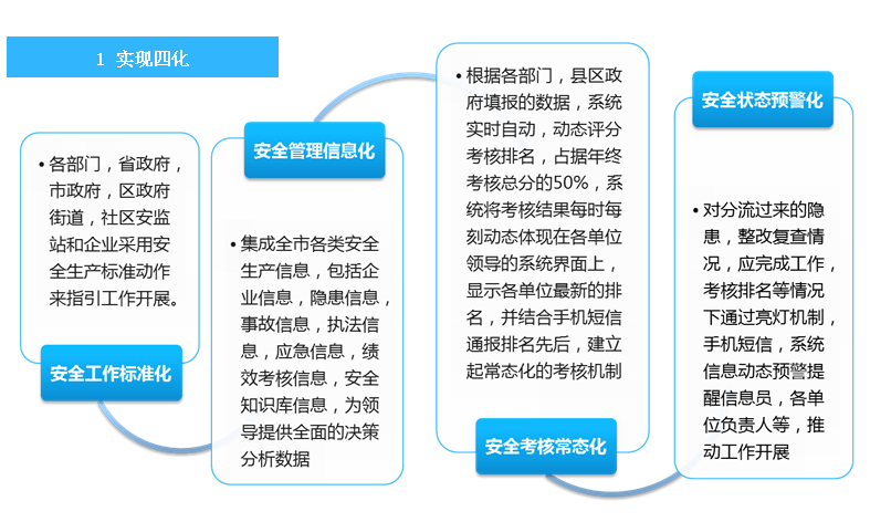 對省、市、區縣政府相關職能部門設立績效考核指標,突出過程考核、量化考核。信息平臺自動統計、自動計分、自動排名,考核結果納入年度安全生產一崗雙責責任制考核,通過績效考核,有效促進屬地、行業部門履行各司其職、齊抓共管。