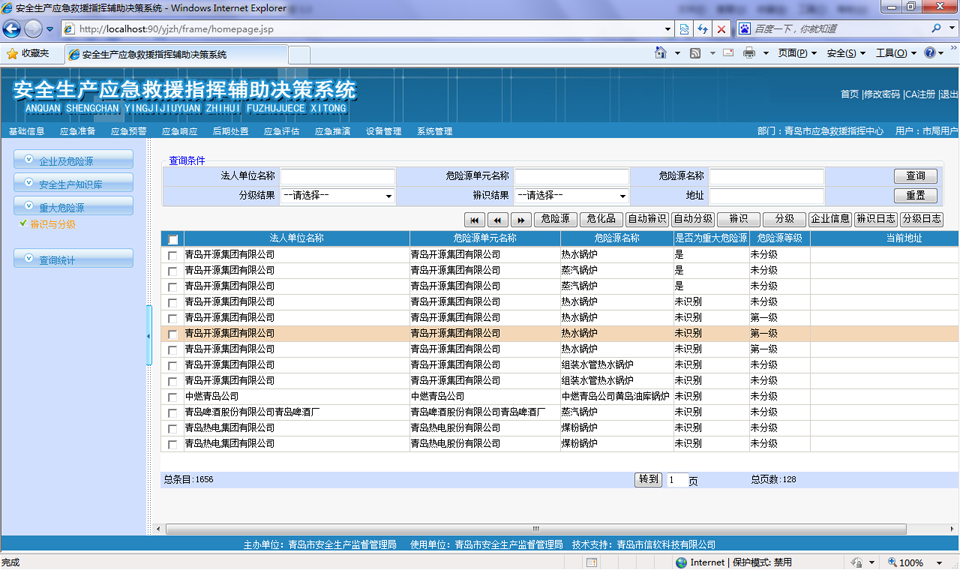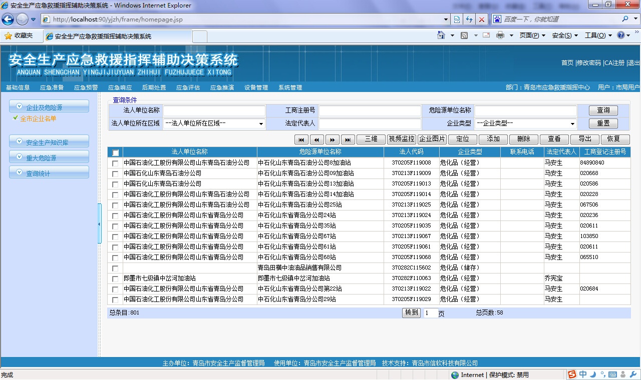 ? 對存在危險源的企業(yè)進行管理和查詢,可以按地區(qū)、經(jīng)濟類型、所屬行業(yè)等支持多種查詢條件進行綜合查詢,查詢結果提供企業(yè)和所屬危險源的具體信息、以樹形結構展示單位基本情況、及其附屬的安全評價、行政許可等分類信息,方便政府主管部門查看危險源企業(yè)的各種動態(tài)情況??梢栽诰€查詢調閱危險源視頻監(jiān)控信息、三維模型信息、GIS詳細信息,企業(yè)及危險源信息可以導出到excel或者word中。