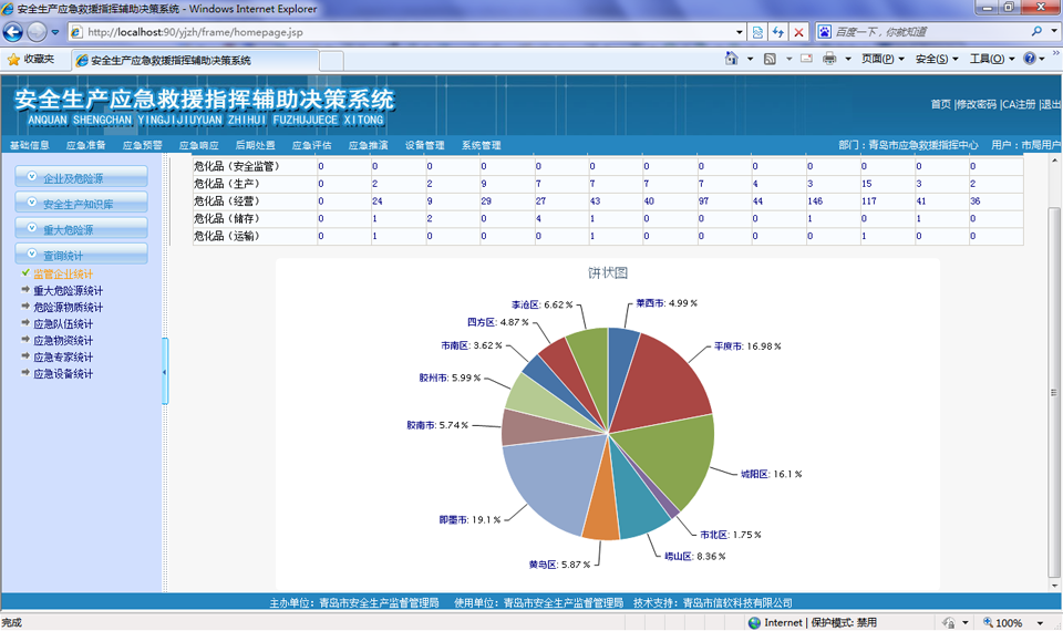 以醒目的報表形式,對重大危險源分布、監(jiān)管企業(yè)、危險物質、應急資源進行統(tǒng)計列表展示,并支持多層次頁面鏈接方式查詢與瀏覽重大危險源、企業(yè)綜合信息,支持鉆取功能。并在此基礎上進行數(shù)據(jù)挖掘和深入分析,查詢結果既可以顯示為原始的文本數(shù)據(jù)也可以分類統(tǒng)計總和,提供柱狀、餅狀等各種形式的圖形。