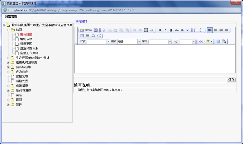 應急預案有綜合應急預案、專項應急預案、現(xiàn)場處置方案構成,由于綜合預案、專項預案、現(xiàn)場處置預案的目錄和編制內容并不相同,在編制預案時,編制人員可隨時讀取預案模板或案例進行參考,系統(tǒng)并可提示幫助信息,輔助完成預案的編制、修訂。