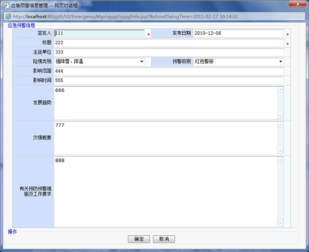 根據(jù)青島市發(fā)布的預警信息并結合安監(jiān)局業(yè)務,提前發(fā)布一些預警信息或通過電話、傳真、手機、短信等方式,獲取預警信息。預警信息需要根據(jù)事態(tài)的進一步發(fā)展核實后,根據(jù)系統(tǒng)權限,向應急事件可能涉及的區(qū)域發(fā)布,當預警結束后解除預警。