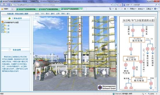 系統(tǒng)集成三維模型子系統(tǒng),根據(jù)企業(yè)名稱或者關鍵設備智能關聯(lián)到三維模型頁面。如下圖所示,左側菜單顯示當前企業(yè)所有的三維模型標準件,右側顯示裝置生產(chǎn)流程示意圖,點擊菜單或者流程圖節(jié)點皆可直接切換到相關視點。