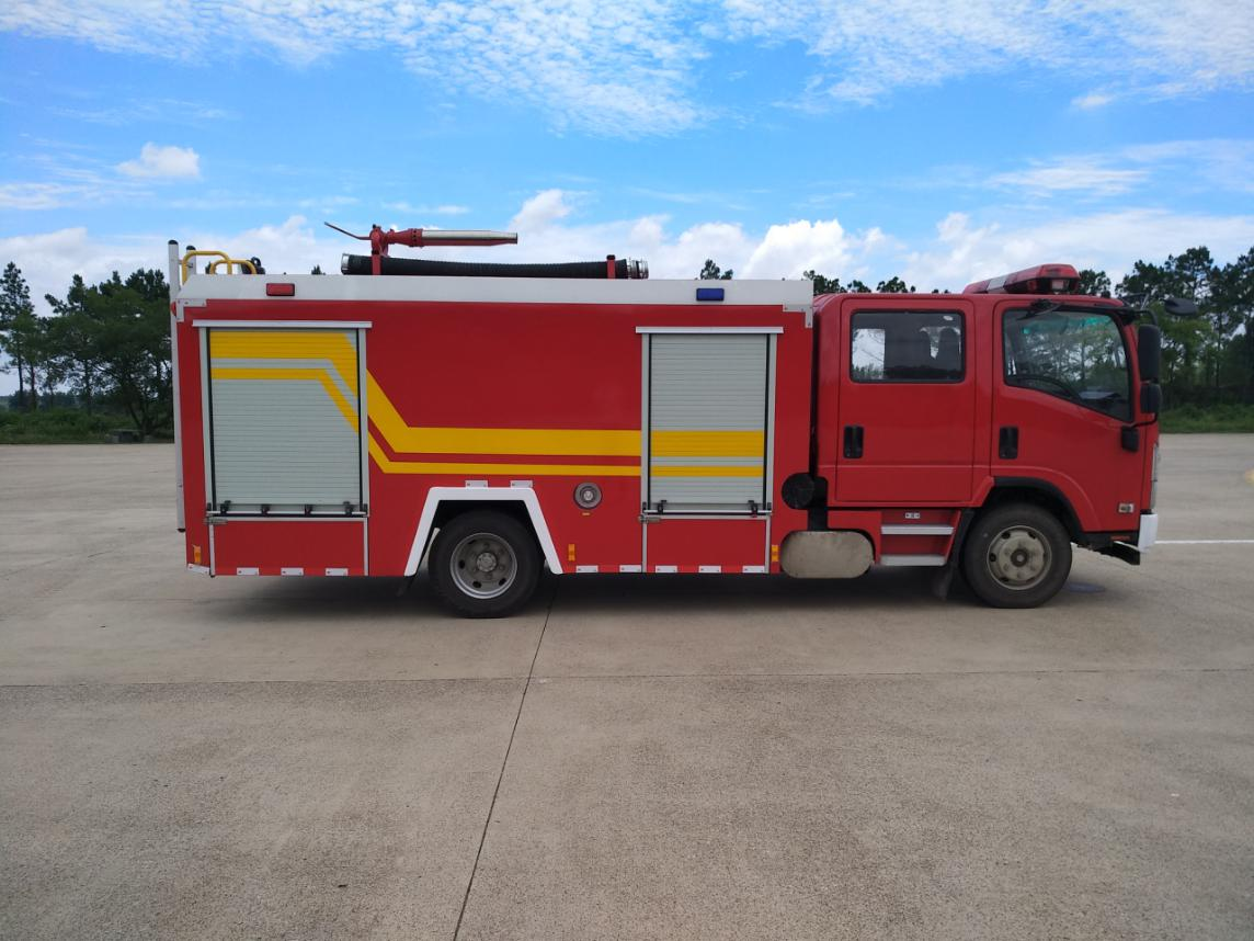 CLW5100GXFSG35/QL型水罐消防車,采用重慶五十鈴700P,型號(hào)QL1110ANKAY二類底盤改裝而成。整車由消防員乘員室和車身兩大部分組成,乘員室為雙排駕駛室,可乘坐 3+3 人,該車為外露罐結(jié)構(gòu),車身前部為器材箱,中部為水罐,后部為泵房。載液罐體為優(yōu)質(zhì)碳鋼,內(nèi)部噴涂環(huán)氧底漆及環(huán)氧瀝青漆,與底盤采用彈性連接,載水量3550kg,裝備了CB20.10/15.30中低壓消防泵,額定流量15/30 L/S,車頂安裝PS30-50D型消防炮。該車最大的特點(diǎn)是載液量大、操控性好、維修簡(jiǎn)便。可廣泛應(yīng)用于公安消防隊(duì)、廠礦企業(yè)及社區(qū)、碼頭等場(chǎng)所,撲救大型油類火災(zāi)和一般物質(zhì)火災(zāi)。
