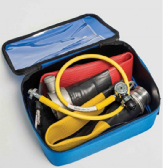 充氣管道救援套組的設(shè)計(jì)和開發(fā)旨在提供一種簡單而有效的方式,使用標(biāo)準(zhǔn)長度的消防水帶提供下游安全吊臂或浮動(dòng)救援輔助設(shè)備。充氣管道救援套組充氣系統(tǒng)可使消防水帶兩端密封,尾部帶2個(gè)密封件,公頭末端為黃色,以便清晰識(shí)別并在使用時(shí)增加可視性。該系統(tǒng)的工作壓力為1.5巴,并使用系統(tǒng)提供的充氣套件進(jìn)行充氣,該系統(tǒng)配有預(yù)設(shè)3.5巴的壓力調(diào)節(jié)器。母頭的尾巴
