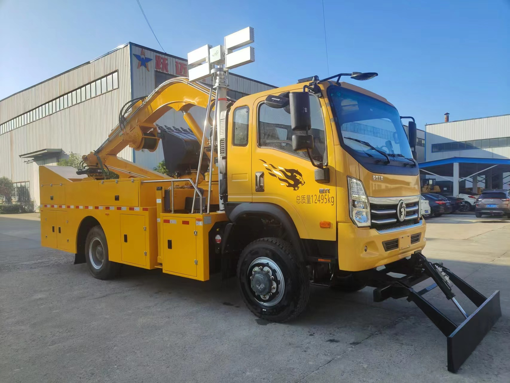 JY40/147是一款多功能輕型應(yīng)急救援車,用于洪澇災(zāi)害引起的建筑倒塌,道路損毀等搶險(xiǎn)救援場(chǎng)景,車輛采用4×4全驅(qū)動(dòng)越野底盤改裝,通過(guò)性能好,具有專用作業(yè)臂架,配置并隨車運(yùn)輸挖斗、破碎錘、抓斗三種輔具,可與作業(yè)臂架快速安裝并更換,實(shí)現(xiàn)起重、挖掘、破拆、抓取功能,車輛前方具有快裝卸式推鏟,后方具有牽引絞盤等裝置,駕駛室頂部安裝升降照明燈,整車具備起重、挖掘、破拆、抓取、發(fā)電、照明、破障、牽引等功能,實(shí)現(xiàn)對(duì)災(zāi)害現(xiàn)場(chǎng)應(yīng)急救援作業(yè)。