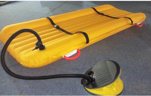 2b、充氣方式分鋼瓶充氣與腳踏泵充氣兩種:氣瓶充氣式擔架是擔架上配有300克氣瓶,拉線拉一下就會擊破氣瓶,快速充氣(氣瓶充氣式擔架也有了腳踏泵,也可以腳踏充氣);腳踏式擔架是直接腳踩泵直接充氣。