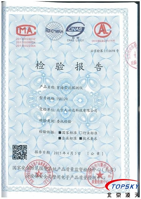 近日,北京天必達科技有限公司研發的YSR-120穿墻雷達探測儀通過公安部安全與電子產品檢測檢驗中心檢驗,檢測報告編號:公京檢第1510698號。