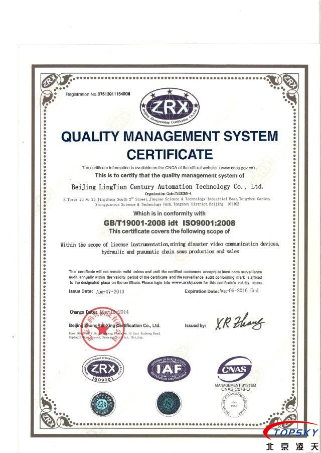 經(jīng)過嚴(yán)格的評審,我司近期按照GB/T19001-2008質(zhì)量管理體系要求,已經(jīng)取得ISO9001質(zhì)量管理體系認(rèn)證,認(rèn)證的獲得,標(biāo)志著我司在管理體系上已經(jīng)具備較高水平。認(rèn)證證書的中英文如下: