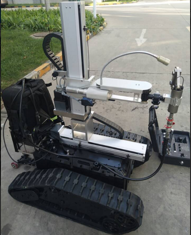 主要是用來處理戰術破拆式機器人,也可用于遠程遙控偵察人難以達到的地形的一種機器人機器人配備十字滑臺靈活調動工具的工作位置,可加載手持式切割機,還可以加載獨立電動液壓工具其包括:微型開門器、微型擴張器、微型剪切器之間可以靈活更換,底盤采用履帶結構,能適應各種地形快速作戰部署。