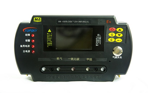BMK-A便攜式煤礦氣體可爆性測定儀(以下簡稱測爆儀),是用于煤礦井下使用的礦用本安兼隔爆型攜帶式儀器。測爆儀用于煤礦井下,由礦山救護隊員攜帶進入災(zāi)區(qū),監(jiān)視作業(yè)環(huán)境周圍氣體組份是否存在爆炸危險。也可由消火人員攜帶,在處理自然發(fā)火或啟封火區(qū)過程中,檢測周圍環(huán)境或密閉內(nèi)空氣中甲烷、氧的濃度值,在儀器液晶顯示屏上直接顯示出O2、CH4、CO的濃度值和環(huán)境溫度值,并顯示出“爆炸三角形”的圖形及各氣體組份所構(gòu)成的坐標(biāo)點,臨近或達到警界限時儀器同時發(fā)出聲、光警報。