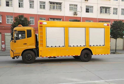 廂體外部鋼材為優質冷軋鋼板,內襯優質冷軋鋼板折彎骨架,工藝先進,強度牢固。廂體為全密封結構,具備運輸、防雨、防腐、防火、防銹要求。車廂尾部安裝鋁合金卷簾門。發電機組進排風消聲處理,消聲器做降噪處理。車廂水泵兩側設開門,發電機進風口和排風口防雨百葉窗,工作門下,尾部設有隱藏式抽拉梯,與車廂底板框架連接。