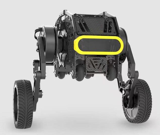 本款雙足機器人是一種足部裝有動力輪子的雙足平衡式移動機器人。這臺機器人可以將輪式機器人的速度優勢,和足式機器人的機動越障性能結合,可以在多地形下高效、靈活的運動。這種機器人也是當下學術研究的熱點。機器人的腿部和機體結構由本末科技自主研發設計,總共由六個直驅型關節電機M1502D驅動。