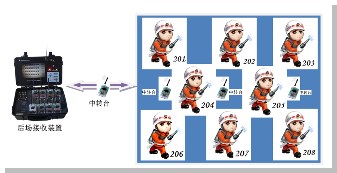 指揮員可根據監視的情況,發出單呼巡查,群呼巡查,單呼撤退,群呼撤退的指令。呼救器佩戴人員可實時接收指令,通過聲響提示查看巡查和撤退的狀態,實時 互動回應,為指揮員直觀判斷現場的情況,提供非??煽康闹笓]依據。該設備配套的呼救器具有遠距離數據通信功能,具有群組獨立使用的功能。其中一個呼救器報警,群組呼救器都能有聲響提示,顯示報警的編組編號,兼有現場指揮員主呼撤退的功能。每套產品編組顯示:1-4組,每組編號顯示:1-8人 ,每套最大使用數量32人,可編不同ID套數:40套,可編不同組號:160組,可編不同ID號:1280個編號 。