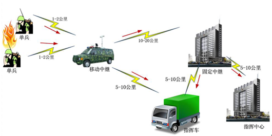 可做單兵發射-指揮監控車或單兵發射-指揮監控中心等應用。